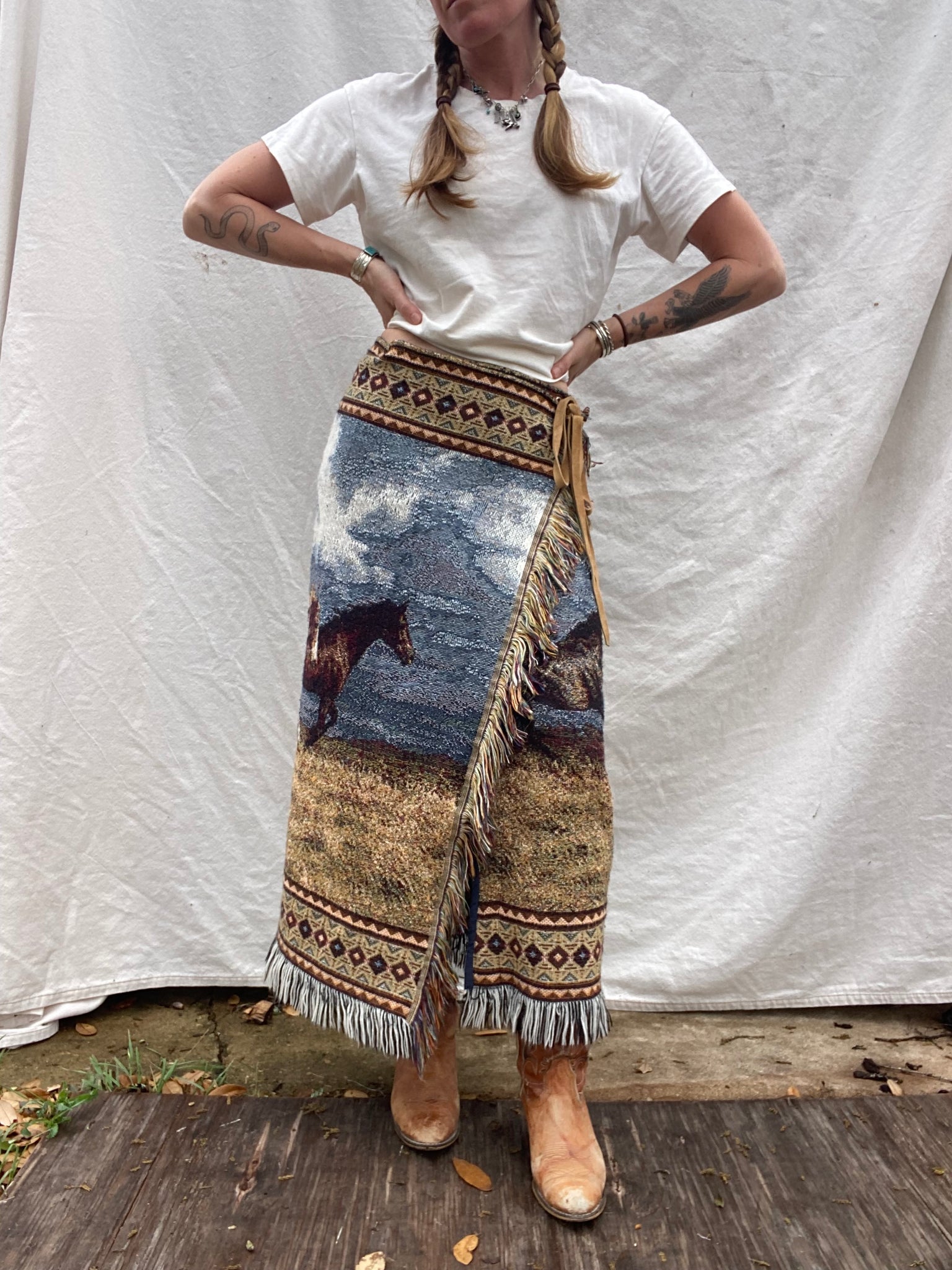 Handmade from upcycled tapestry blanket featuring running horses. Wrap style with leather tie and button closure